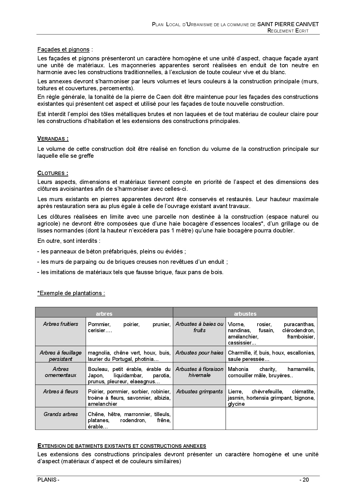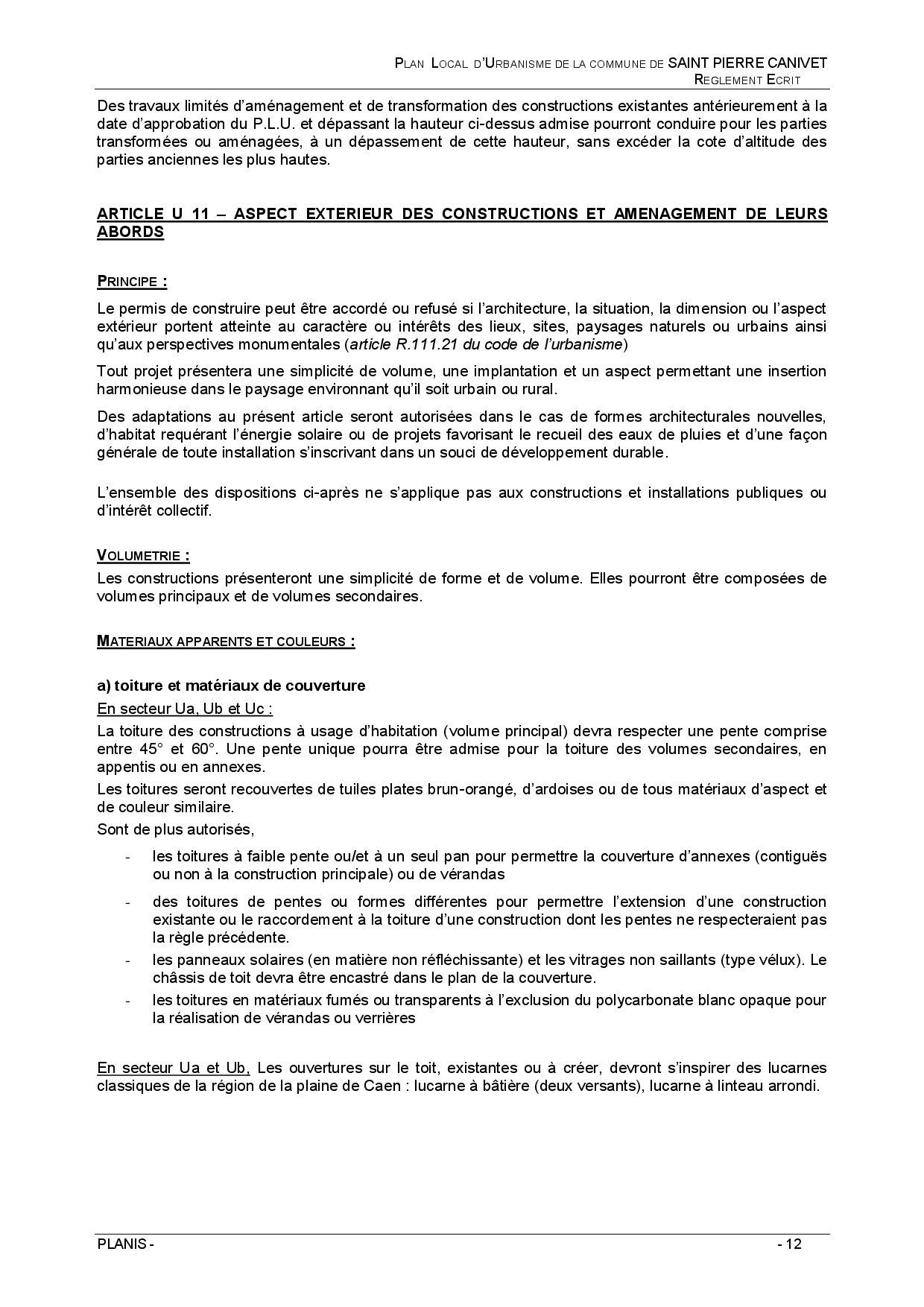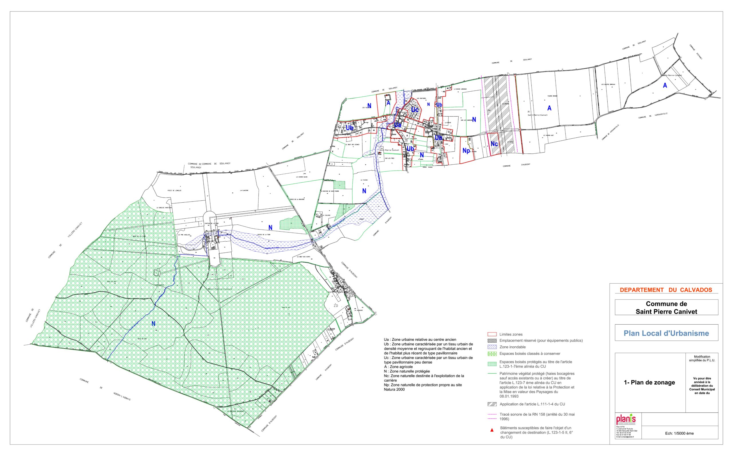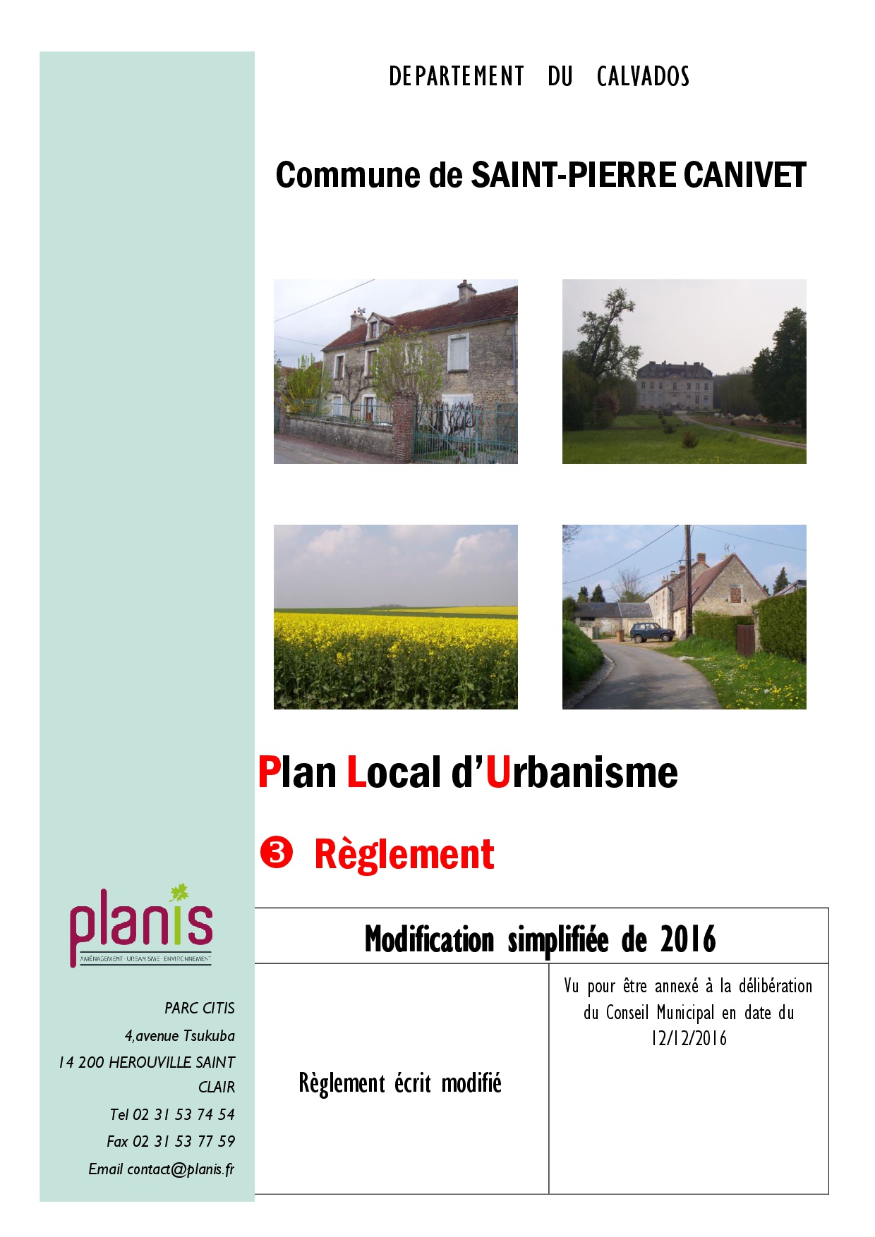 Le plan local d’urbanisme de la commune de Saint Pierre-Canivet a été adopté par le conseil municipal le 26 avril 2010 puis modifié par la délibération n°2016-34 du 12 décembre 2016.